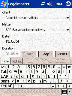 You may enter time on a PDA and import the time via Legalmaster's Generic Import Module.