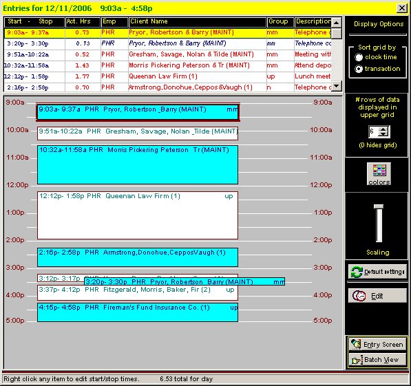 While you are not required to use it, Legalmaster's Remote Data Entry module has a timer option built into it. If you use this timer feature, you may click on the button labeled Day Picture toward the botton left of the above screen to see a graphical representation of how you spent your time. If you see a large gap, you may have omitted to enter something.