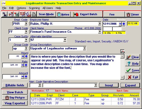 You may enter time via our Remote Transaction Data Entry Module. This is a considerably less expensive alternative if you want more than three people to be entering time simultaneously and you want to limit them to doing not much else in Legalmaster. Remote Entry may run on stand-alone computers or on networks and need not be connected to the computer(s) that are running the rest of Legalmaster. Here's the data entry screen.