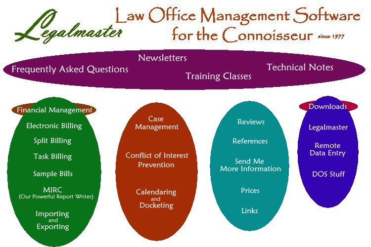 Although Legalmaster has been praised by such independent reviewers as Price Waterhouse ("most sophisticated") and the American Bar Association ("unmatched support"), we feel that the best judgments come from our actual users. We have been manufacturing software for law offices since the mid 1970's. According to The National Law Journal, we are the oldest company in this business in the US.